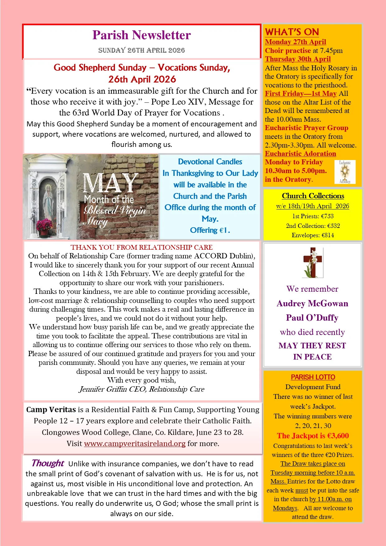 PARISH OFFICE: Mrs. Deirdre Anderson and Mrs. Rita Buckley (01) 4556105 mourneroadparish@eircom.net